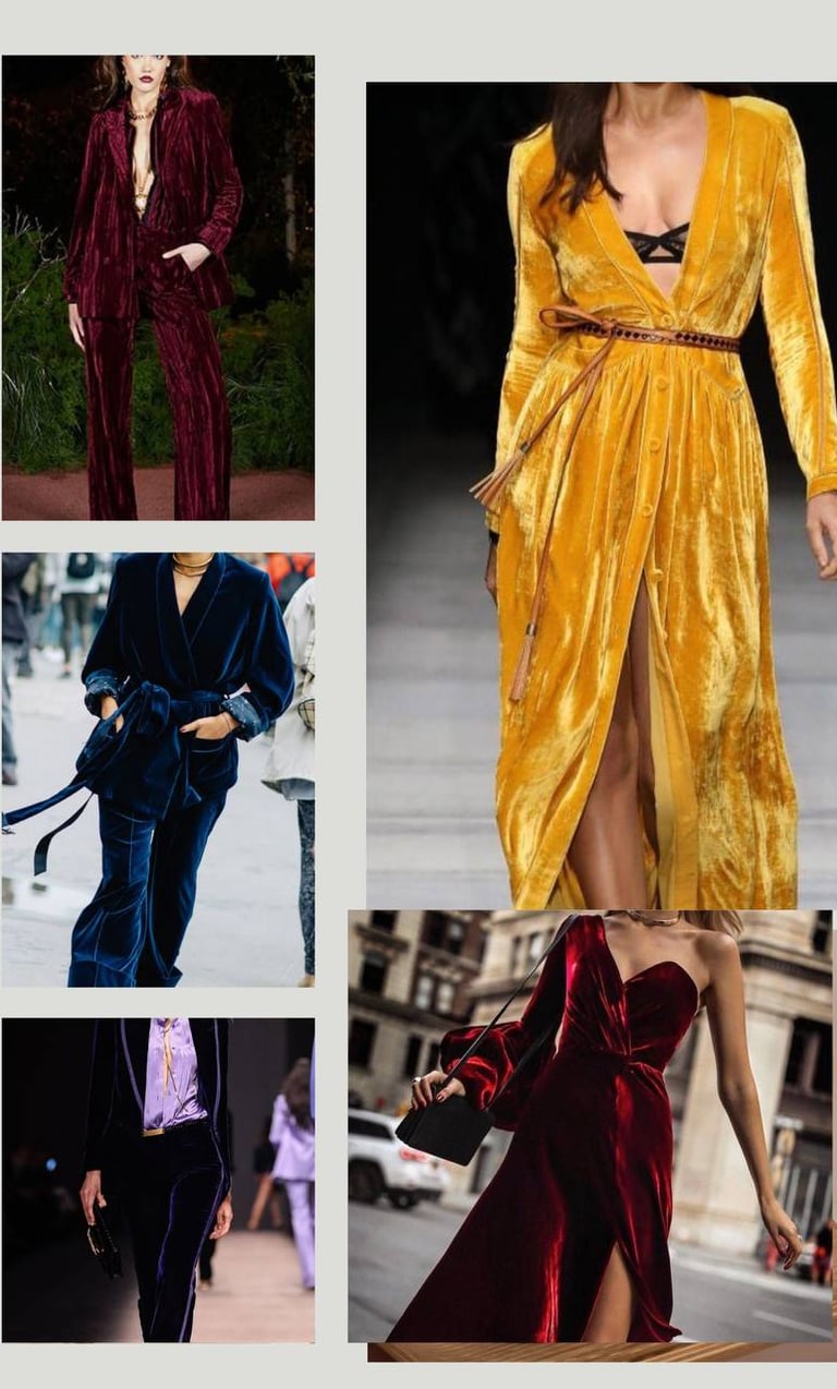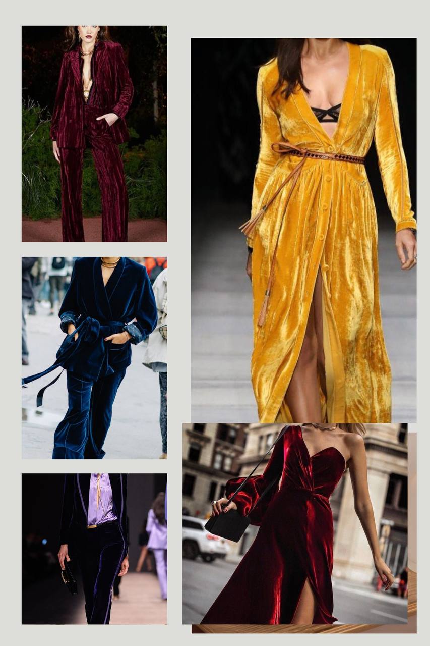 Velvet is trending for fall 2024, bringing luxury and warmth to evening wear, dresses, and jackets. Trending colors include deep emerald, burgundy, navy blue, and purple, perfect for the season.